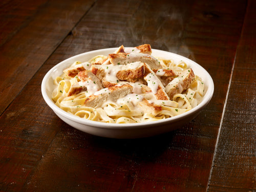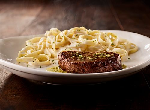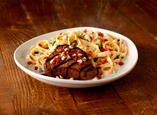 Grilled sirloin* tips over fettuccine alfredo, tossed with gorgonzola...